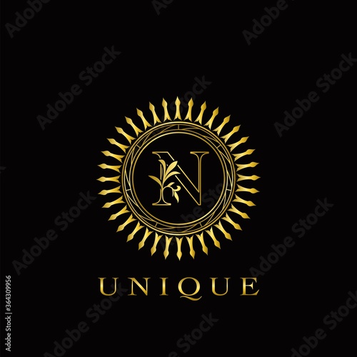 Fototapeta premium Golden Circle Deco N Luxury Floral Letter Logo Design. Monogram unique emblem ornate nature floral leaf with initial letter logo