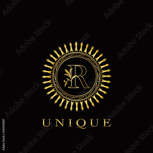 Naklejka premium Golden Circle Deco R Luxury Floral Letter Logo Design. Monogram unique emblem...