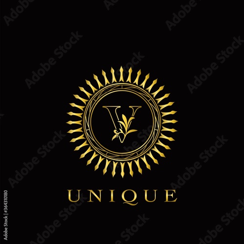 Naklejka premium Golden Circle Deco V Luxury Floral Letter Logo Design. Monogram unique emblem...
