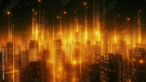 Fototapeta premium Golden city lights, futuristic cityscape, night, energy beams, tech background