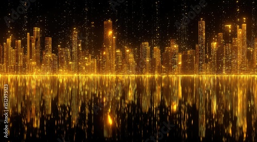 © studio, Naklejka premium Golden cityscape reflected in still water, glittering particles in night sky