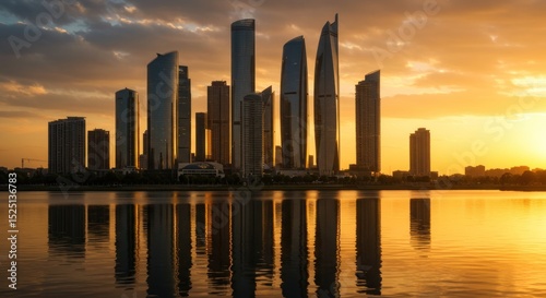© fabrian, Fototapeta premium Golden cityscape reflects in tranquil water
