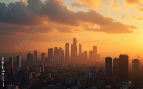 © wu, Fototapeta premium Golden Clouds Illuminate Cityscape at Sunset. High quality