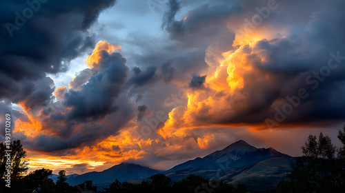 © Fonlinepix, Naklejka premium Golden clouds stretch across the evening sky, gently lit by the last rays of sunlight as the mountains stand tall below.