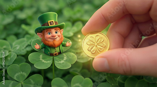 © ChaoticDesignStudio, Fototapeta premium Golden coin with four-leaf clover held by fingers near tiny leprechaun. St Patrick's Day celebration and folklore concept.