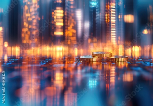 © ANUAR, Obraz premium Golden Coins on Digital Cityscape Background