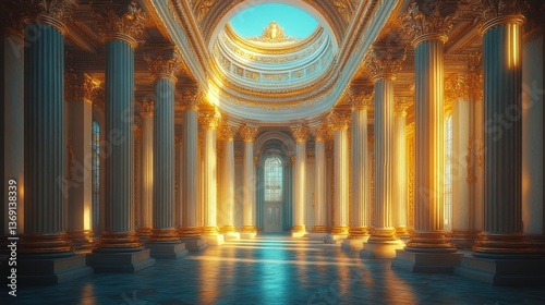 © Yeti, Obraz premium Golden colonnaded hall, sunlit interior, ornate architecture, ancient temple