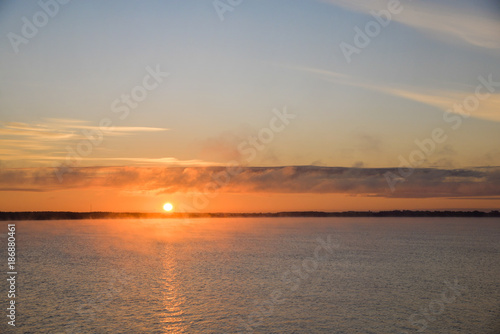 Naklejka premium Golden, colorful, abstract sea sunrise view at horizon, vibrant sky landscape...