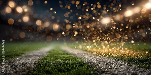Naklejka premium Golden confetti and glitter raining down onto vibrant green football field. Stadium lights in background create festive bokeh, which is blurred.