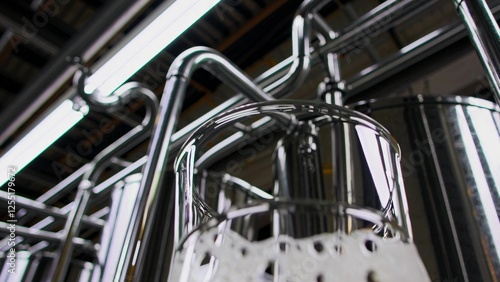 Fototapeta premium Golden craft beer streaming into glass inside sleek brewery, gleaming stainless steel equipment surrounding brewing process in professional industrial setting