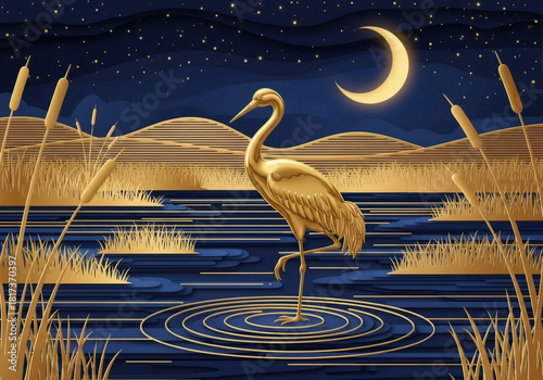 © Evarelle, Obraz premium Golden crane bird standing in water at night with crescent moon and stars. Paper cut style illustration of nature landscape with reeds and ripples