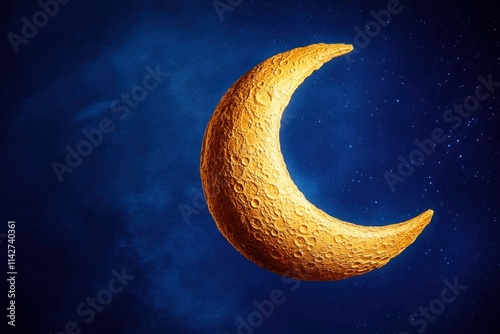 © VideoStones, Fototapeta premium Golden crescent moon against a dark blue starry night sky.