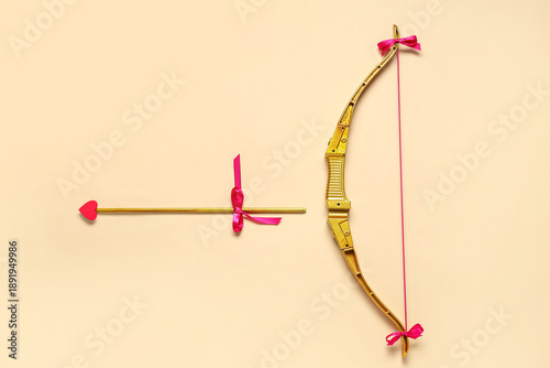 © Pixel-Shot, Fototapeta premium Golden cupid's bow with arrow on color background. Valentine's Day celebration