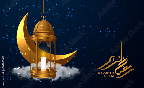 Naklejka premium golden 3D moon crescent with lantern lamp and ramadan kareem calligraphy