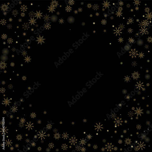 Fototapeta premium Golden delicate openwork snowflakes scatter on a black background. Festive...