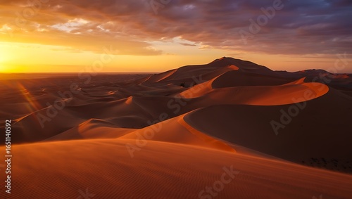© Kumkum, Obraz premium Golden desert dunes at sunset with dramatic clouds and distant mountains