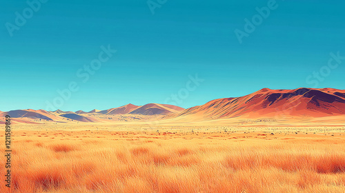 © dropideas, Fototapeta premium Golden Desert Landscape: Majestic Mountains under a Clear Blue Sky