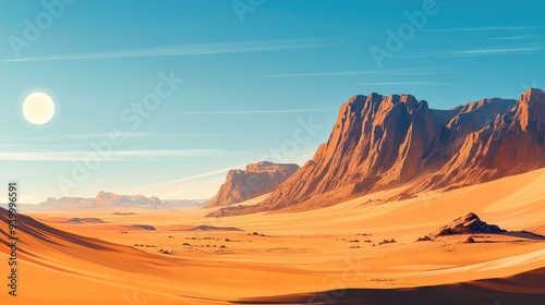 © pinporn manosri, Naklejka premium Golden desert landscape with tall sand dunes and distant rocky outcrops, vast and endless horizon under a hot sun
