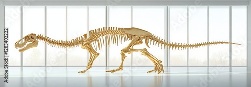 © sunny, Obraz premium Golden Diplodocus Dinosaur Skeleton in Minimalistic Gallery with Natural Light