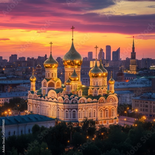 © Oleksandr, Fototapeta premium golden domes of a large cathedral rising above a bustling city, modern and historic blend, vibrant sunset lighting, dynamic and picturesque
