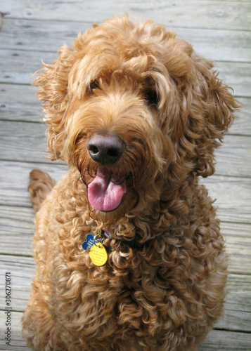 © Janice Higgins, Fototapeta premium Golden doodle dog sitting smilling