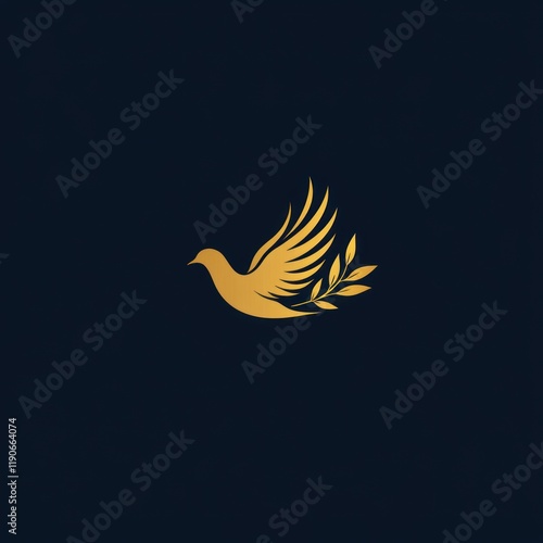 © lestari, Obraz premium Golden dove flying, olive branch, dark background, logo design