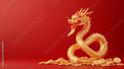 Obraz premium Golden Dragon and Coins: A majestic golden dragon statue, coiled elegantly, sits amidst a pile of gold coins against a rich red background, symbolizing prosperity, good fortune, and celebration.