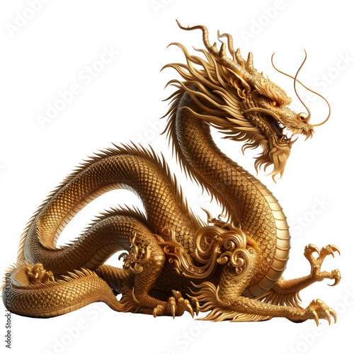 © peerasak, Obraz premium Golden dragon, conveying a strong feeling of awe,Zodiac 3D illustration, isolated on a transparent background.
