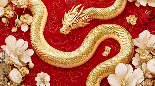 Obraz premium Golden dragon entwined among blooming flowers on a vibrant red backdrop during a festive celebration