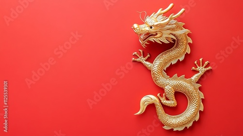 © Andrei, Fototapeta premium Golden Dragon Figurine on Red Background, Lunar New Year 2024, Chinese Zodiac Symbol, Copy Space
