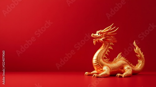 Fototapeta premium Golden dragon figurine on vibrant red background, symbolizing prosperity and...