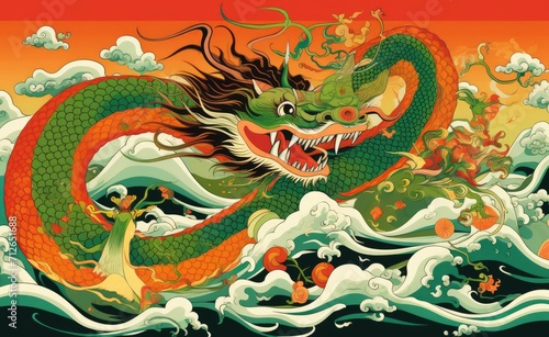Naklejka premium Golden dragon images in Chinese and Japanese styles set against a pastel gold...