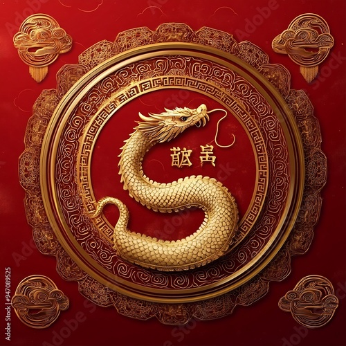 © semi bold, Obraz premium Golden Dragon in a Circular Frame