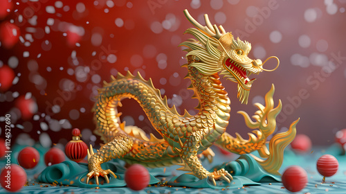 Obraz premium Golden Dragon of Prosperity: A majestic golden dragon figurine, symbol of good fortune and prosperity, sits amidst red and gold decor, evoking a sense of celebration and tradition.