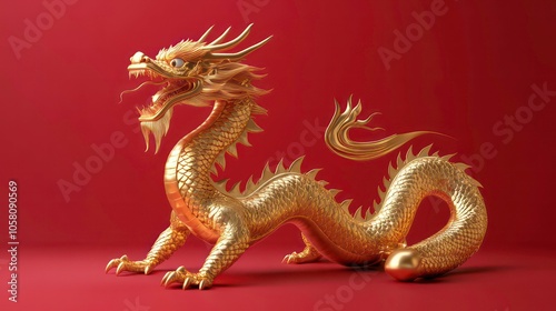 Obraz premium Golden Dragon on Red Background - 3D Render, Chinese Dragon, Mythical Creature, Dragon, 3D Model