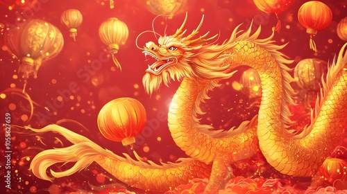 © rehan, Fototapeta premium Golden Dragon Soaring Amidst Red Lanterns and Shimmering Lights
