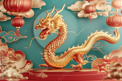 Obraz premium Golden Dragon with Red Lanterns and Clouds