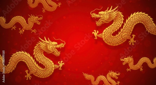 Fototapeta premium Golden Dragons on Red: Majestic gold dragons elegantly wind across a rich red...