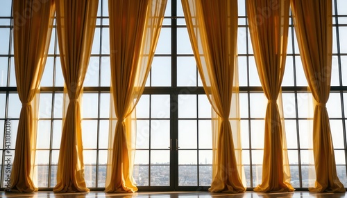 © Salma, Obraz premium Golden drapes on large windows, city view