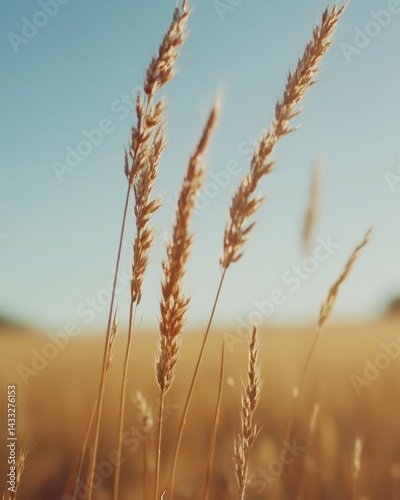 © embun, Fototapeta premium Golden dry grass blades illuminated by sunlight under clear sky