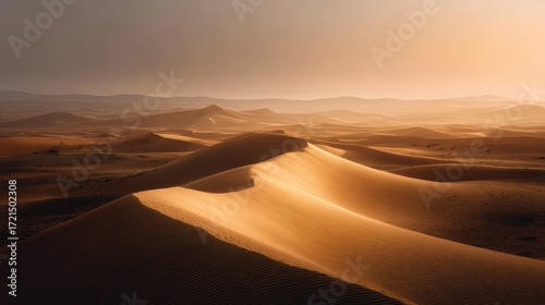 © Napat.T, Naklejka premium Golden Dunes of the Sahara Desert at Sunset with Warm Light and Serene Atmosphere