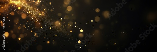 Fototapeta premium Golden dust particles swirl, dark backdrop, bokeh effect, design overlay.