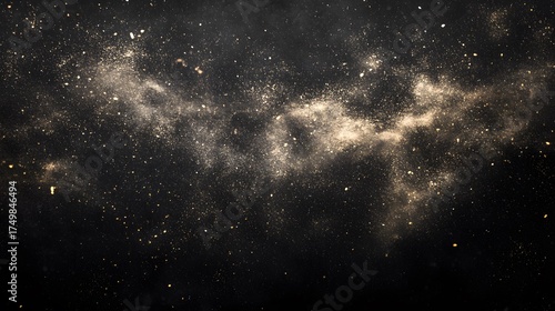 Fototapeta premium Golden dust sparkles in dark cosmic nebula background.