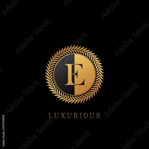 © SimpenArt, Fototapeta premium Golden E letter Logo Luxurious Nature Leaves, elegance vector design concept circle floral leaves with negative space letter logo.