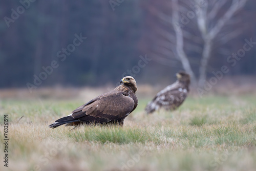 © Jarosław Kochnio, Fototapeta premium Golden eagle and white-tailed eagle in a meadow against the background of autumn birch