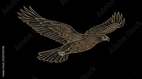 © Mufarokah, Obraz premium Golden eagle illustration, wings spread, flying diagonally across a black background