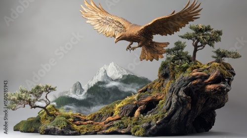 © Murda, Obraz premium Golden eagle sculpture flying over a miniature landscape with trees and mountains.