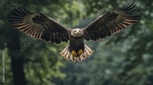 © mas, Obraz premium Golden Eagle soars majestically amidst green forest trees, wings outstretched, focused gaze, nature backdrop