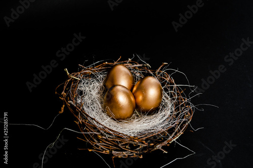 © Elina, Fototapeta premium Golden Easter Eggs in birds Nest on black background. Easter Holiday concept abstract background copyspace top view several objects.