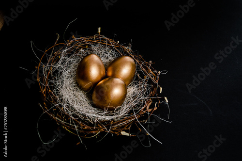© Elina, Fototapeta premium Golden Easter Eggs in birds Nest on black background. Easter Holiday concept abstract background copyspace top view several objects.